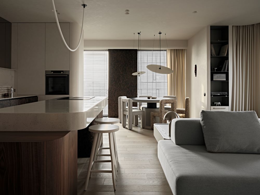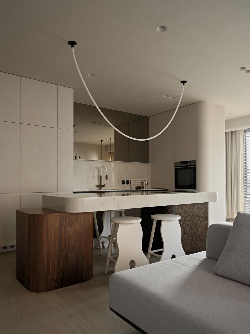 Основная задача — сохранить планировку, но полностью изменить ощущение пространства с помощью мягкой геометрии, продуманного света и правильных материалов.